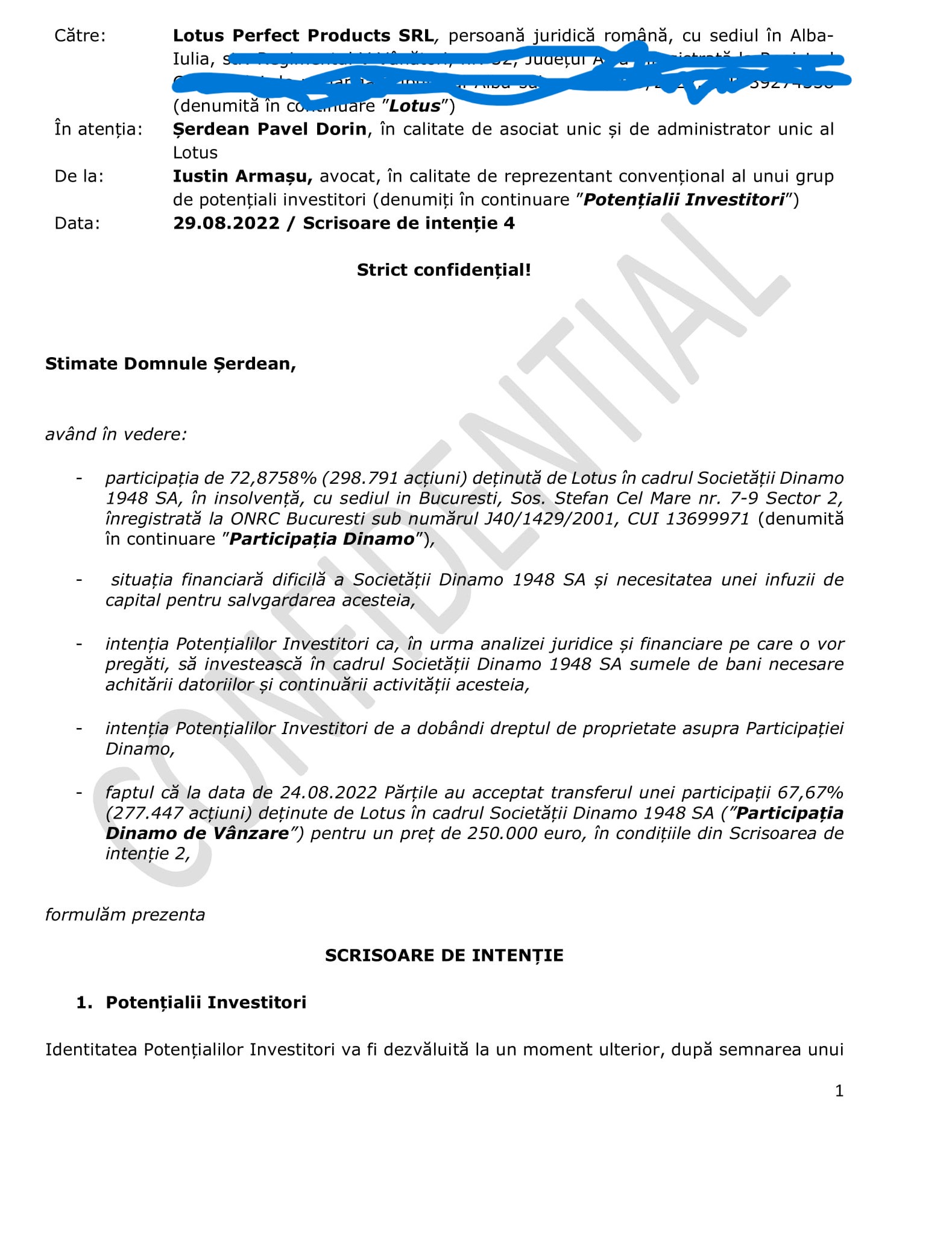 Data de 29 August reprezintă o bornă importantă. La o zi după ce ProSport a dezvăluit cine sunt „potențialii investitori” care au preferat să rămână în anonimat față de vânzătorul Dorin Șerdean, administratorul Lotus primește o nouă propunere în baza unor mesaje transmise de același Justin Armașu.
