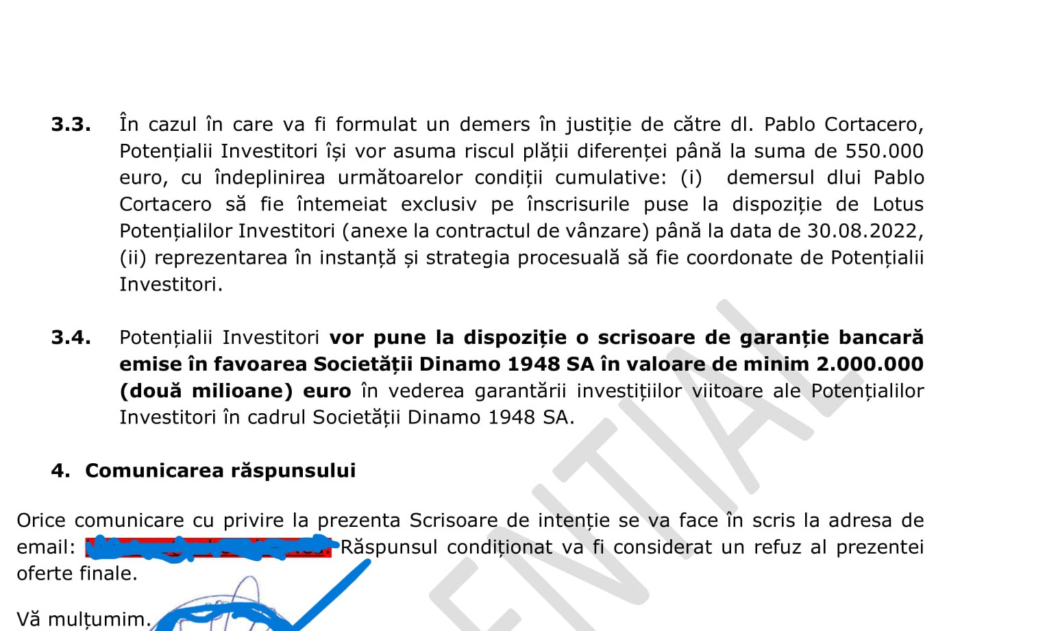 Un detaliu important în această ofertă este legat de garanția de două milioane euro solicitată de Dorin Șerdean în numele lui Dinamo. Conform facsimilului, cumpărătorul a fost de acord cu această cerere a vânzătorului. Astfel s-a angajat ca, în termen de 30 de zile de la parafarea înțelegerii, să pună la dispoziția lui Dinamo acești bani.