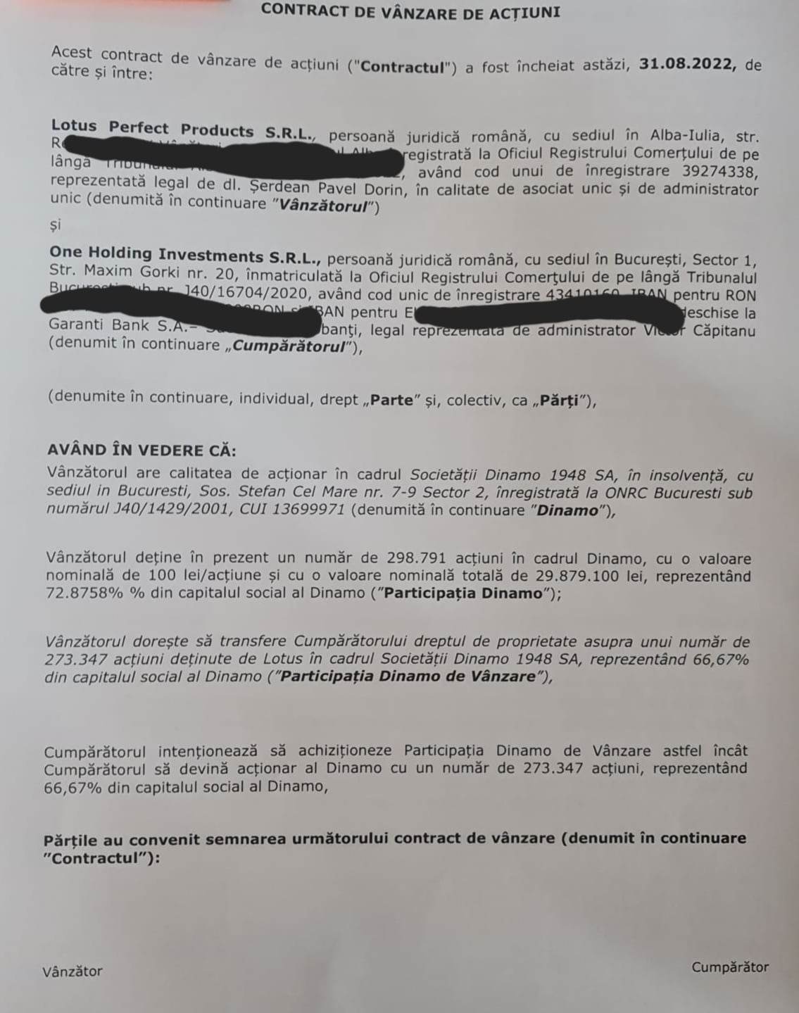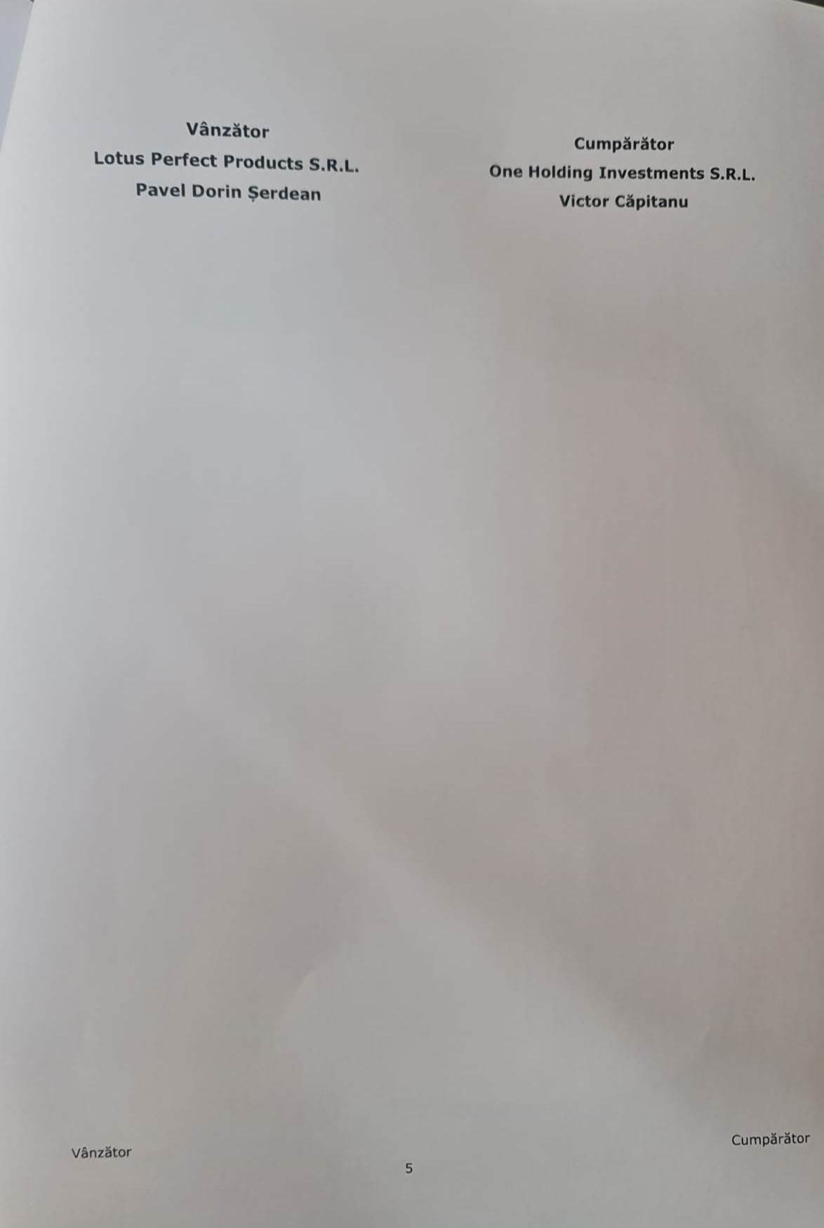 În acest context, la 31.08.2022, la trei zile după ce informația a fost publicată în ProSport, Dorin Șerdean primește un „contract de vânzare acțiuni”. De data asta apare, direct, „cumpărătorul One Holding Investments SRL”. Pe ultima pagină, menționăm că nu există semnătură pe facsimilul obținut de PlaySport.ro, este trecut Victor Căpitanu.