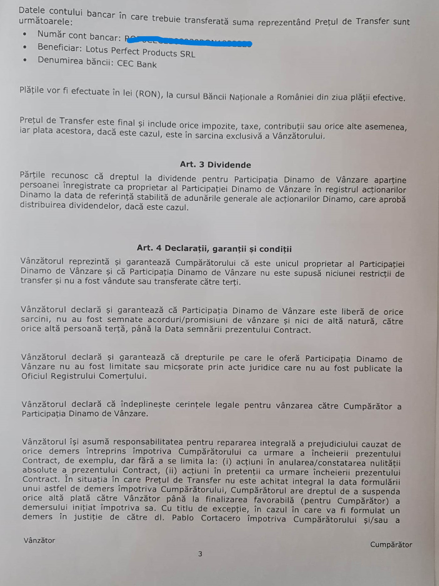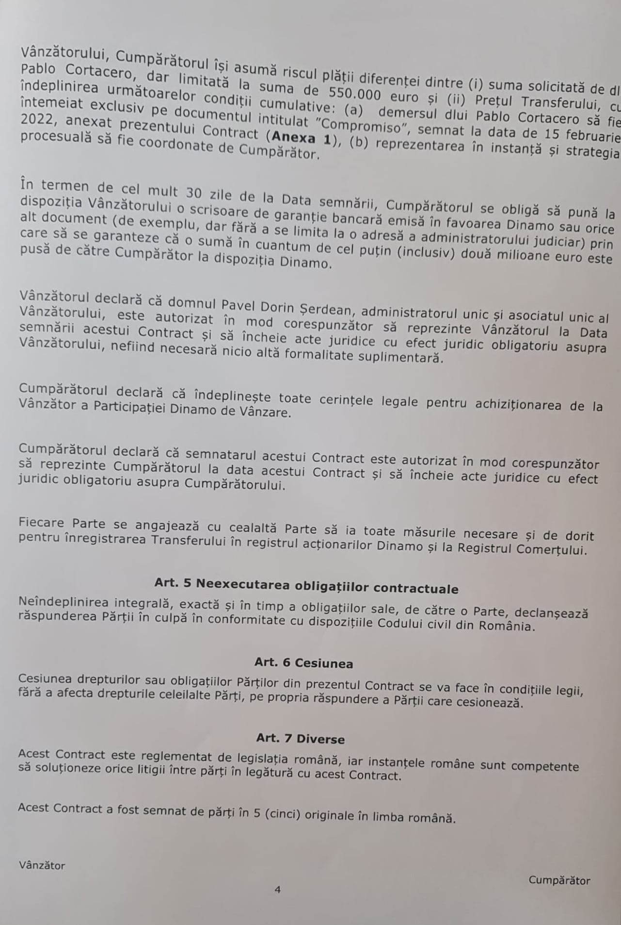 La fel, în contract apare și suma de 550.000 euro, banii virați, în 2020, de Pablo Cortacero, fostul administrator Lotus, de la care Dorin Șerdean a preluat, printr-o înțelegere scrisă, firma care deține pachetul majoritar de acțiuni (72,8%) de la Dinamo. Practic, One își asumă și această cheltuială și potențialele litigii rezultate din această înțelegere între Dorin Șerdean și Pablo Cortacero.