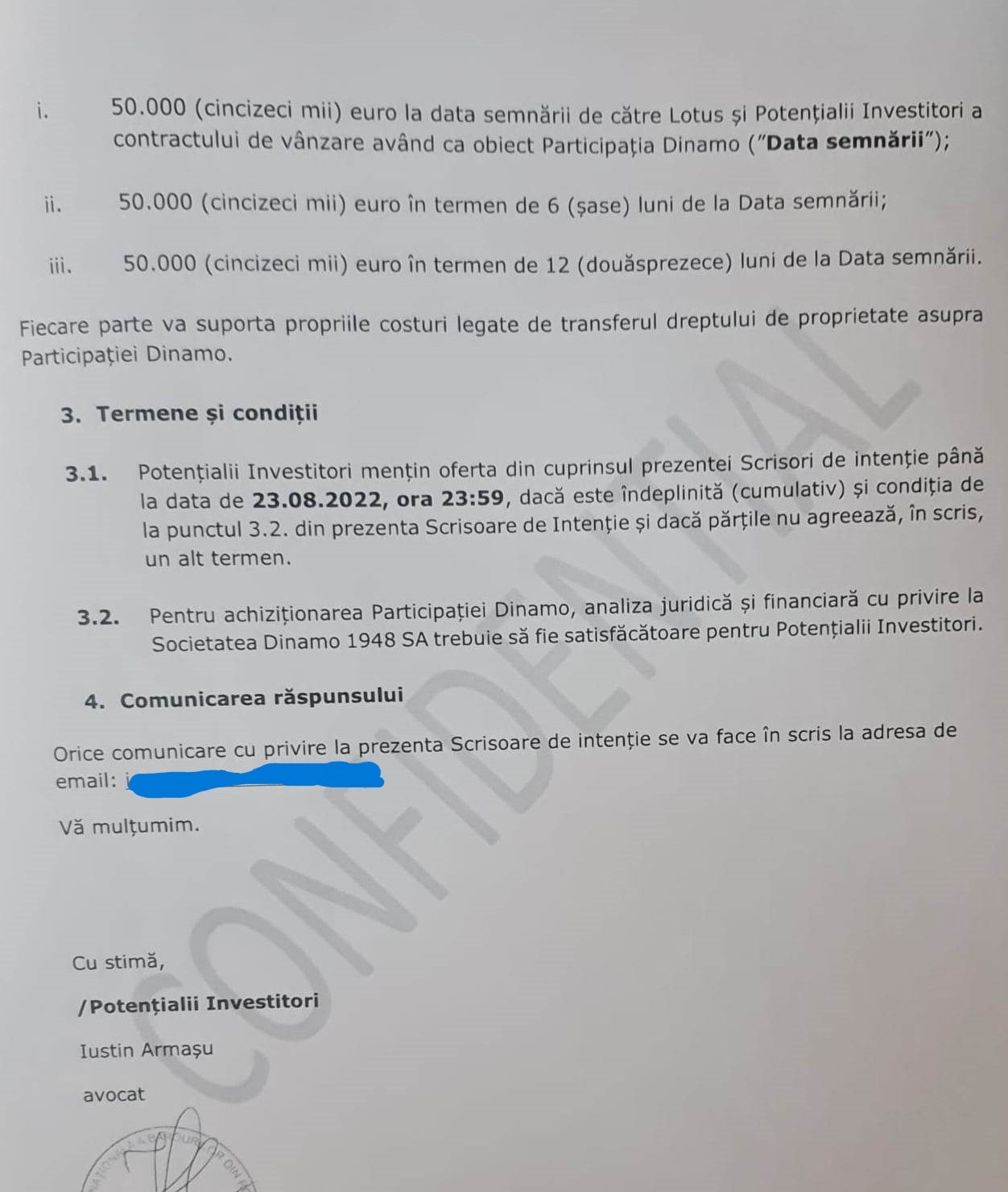 Conform documentelor pe care PlaySport.ro le publică, prima ofertă vine sub forma unei scrisori de intenție pe care o semnează, la data de 19 August, avocatul Justin Armașu, „în calitate de reprezentant convențional al unui grup de potențiali investitori”.