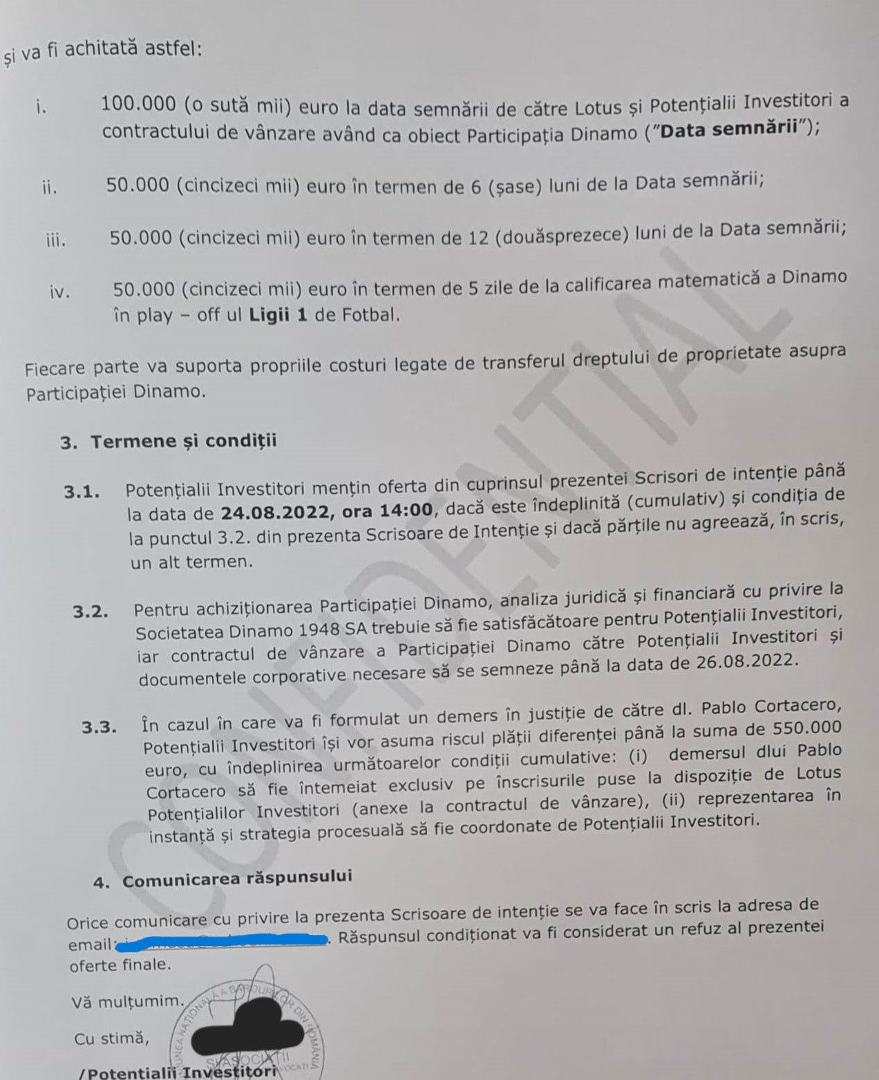 PlaySport.ro vă prezintă, în exclusivitate, ofertele scrise pe care grupul One le-a făcut pentru cumpărarea lui Dinamo. Este vorba de negocierile purtate la sfârșitul lunii August, atunci când Dorin Șerdean, administratorul firmei Lotus, a primit propunerile scrise pentru vânzarea pachetului de acțiuni din cadrul SC Dinamo 1948 SA.