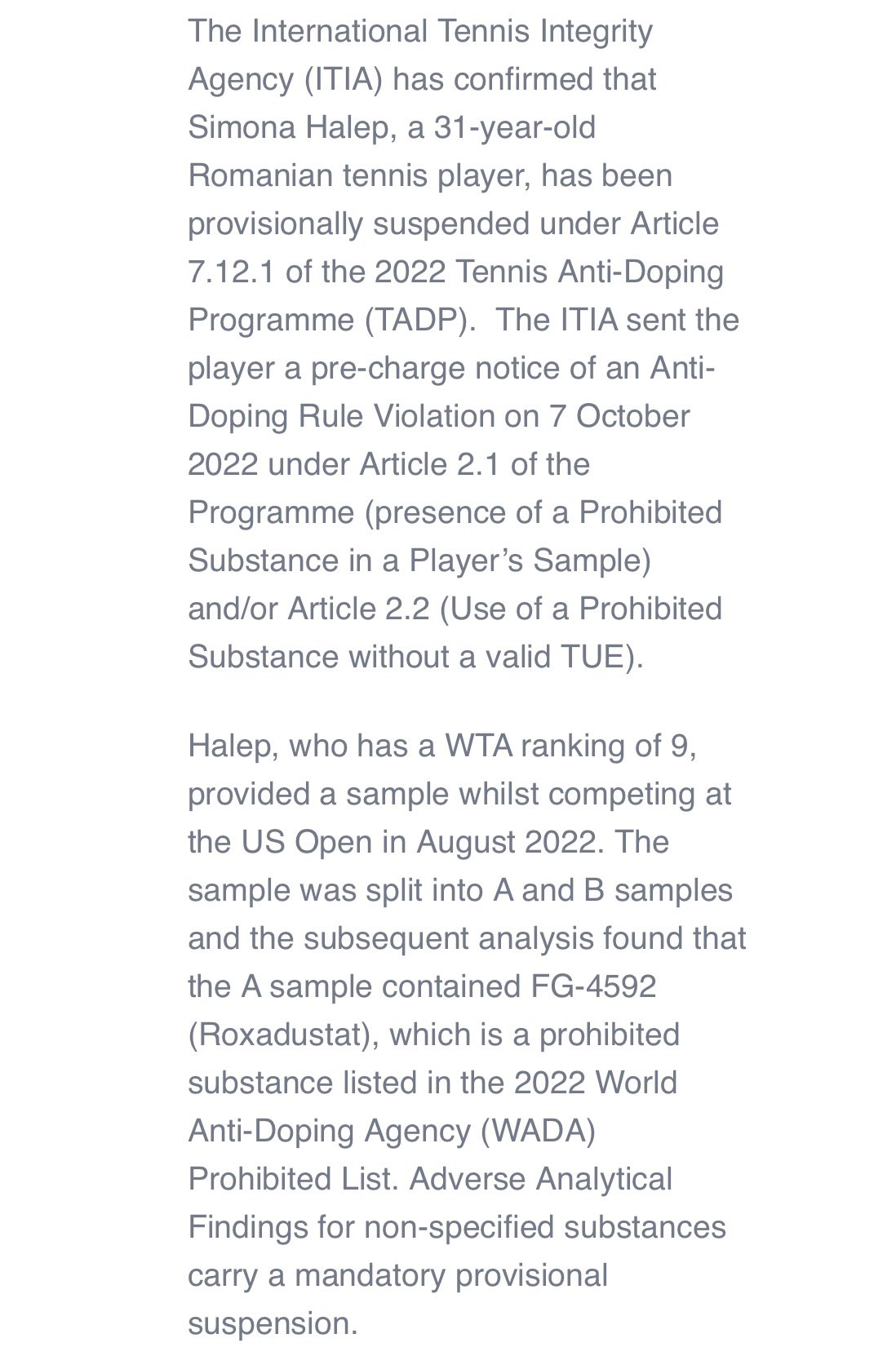 „Agenția Internațională de Integritate a Tenisuluia confirmat că Simona Halep, jucătoarea de tenis de 31 de ani din România, a fost suspendată conform articolului 7.12.1 a Programului Anti-Doping (TADP).