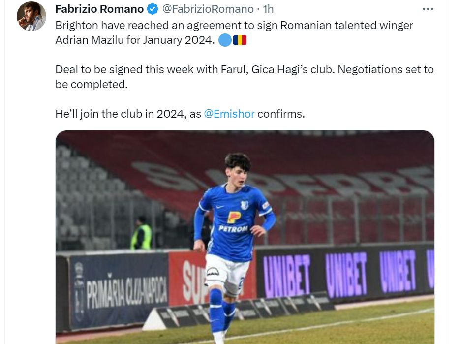 Expertul în transferuri din lumea fotbalului, Fabrizio Romano, a preluat știrea din Playsport despre mutarea lui Mazilu și a anunțat tranzacția pe contul său personal de Twitter.