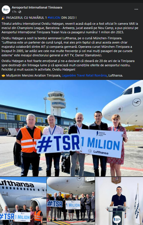Haţegan a fost pasagerul cu numărul un milion din 2023 de pe aeroportul din oraşul de pe Bega, iar arbitrul din Arad a fost primit de o delegaţie oficială după ce a coborât din avion. Inclusiv directorul aeroportului, Daniel Stamatovici, a fost prezent pentru a-l întâmpina pe Haţegan.