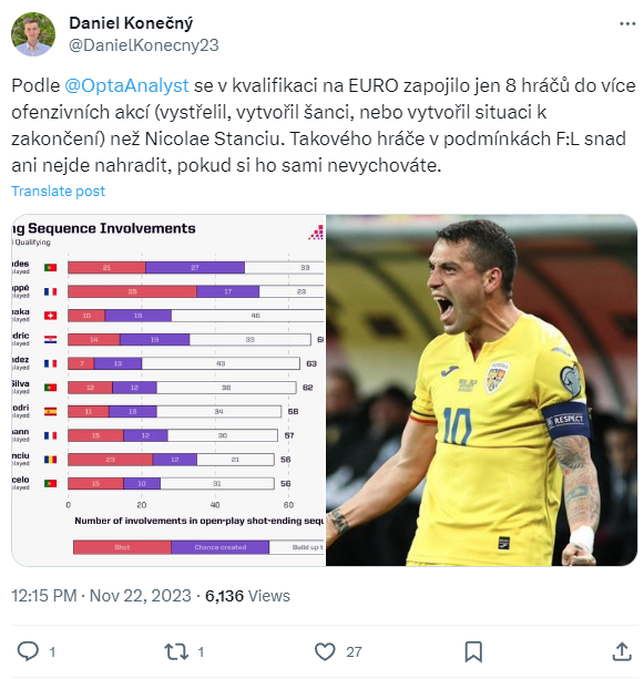 Evoluțiile excelente ale lui Nicolae Stanciu se văd și în statistici. Potrivit Opta Analyst, Stanciu ocupă locul 9 în topul fotbaliștilor care au fost implicați în acțiuni ofensive la echipa națională, în preliminariile Euro 2024. Clasamentul a fost realizat ținând cont de șuturi, ocazii create și faze premergătoare șuturilor.