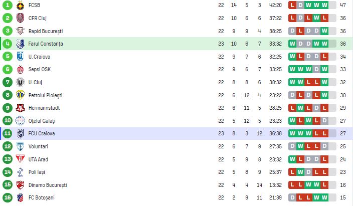 De partea cealaltă, oltenii sunt pe locul 11, cu 27 de puncte, la egalitate cu Oțelul Galați. Echipa lui Adrian Mititelu se poate bate atât pentru play-off, cât și pentru salvarea de la retrogradare.