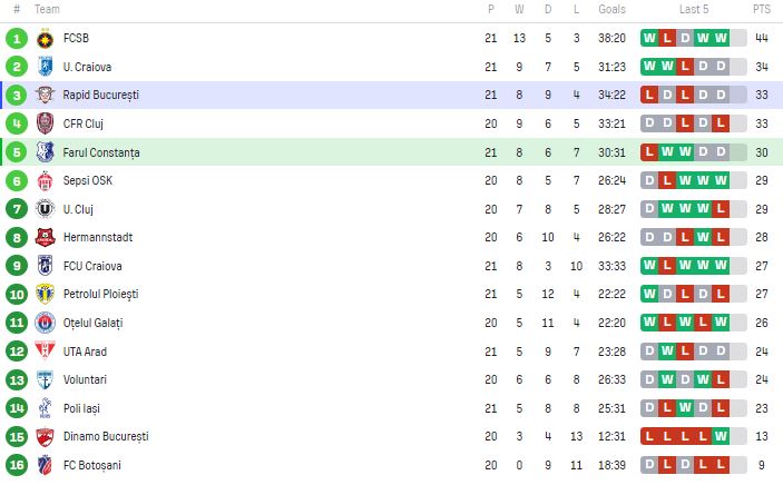După 20 de etape, Farul e pe locul 7, deci în afara play-off-ului, cu 29 de puncte, la egalitate cu U Cluj, locul 5, în timp ce Rapid are 32 de puncte și ocupă locul al patrulea.