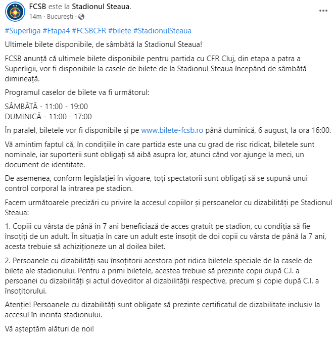 FCSB anunță că ultimele bilete disponibile pentru partida cu CFR Cluj, din etapa a patra a Superligii, vor fi disponibile la casele de bilete de la Stadionul Steaua începând de sâmbătă dimineață.