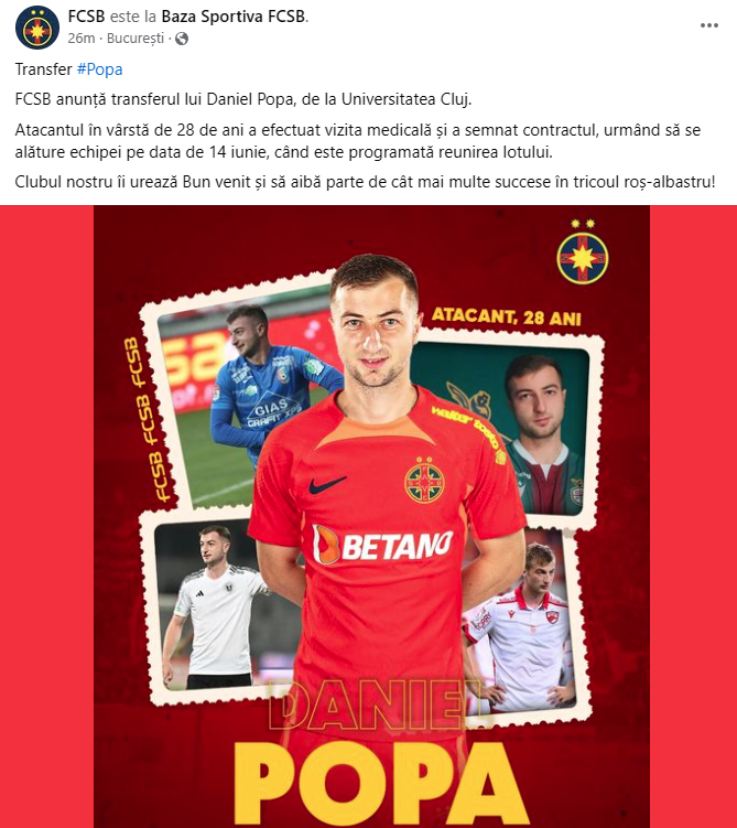 „FCSB anunță transferul lui Daniel Popa, de la Universitatea Cluj.