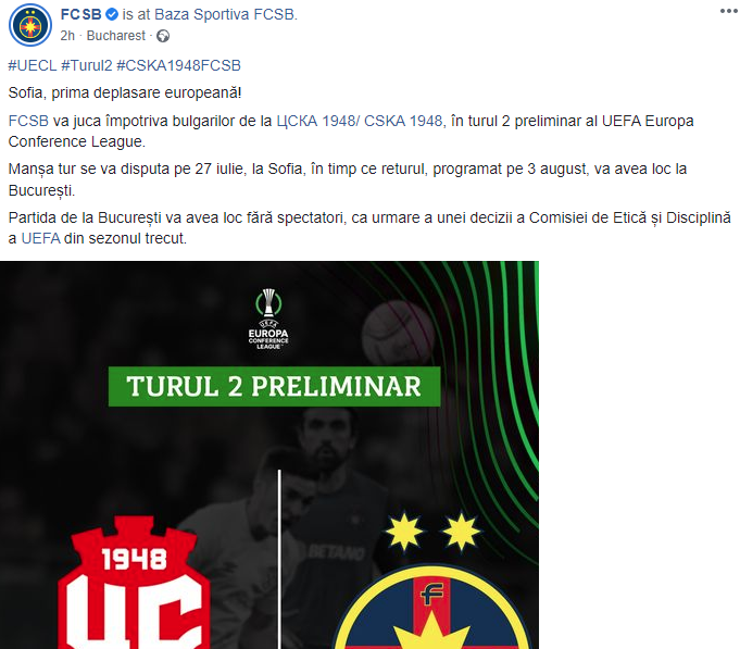 Partida de la București va avea loc fără spectatori, ca urmare a unei decizii a Comisiei de Etică și Disciplină a UEFA din sezonul trecut”, se arată într-un comunicat emis de FCSB.