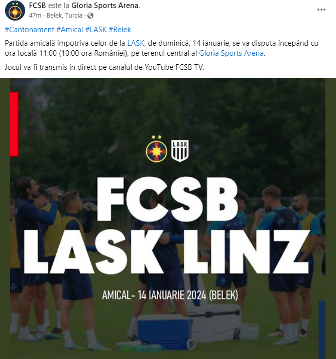 „Partida amicală împotriva celor de la LASK Linz, de duminică, 14 ianuarie, se va disputa începând cu ora locală 11:00 (10:00 ora României), pe terenul central al Gloria Sports Arena. Jocul va fi transmis în direct pe canalul de YouTube FCSB TV”, se arată în comunicatul emis de FCSB.
