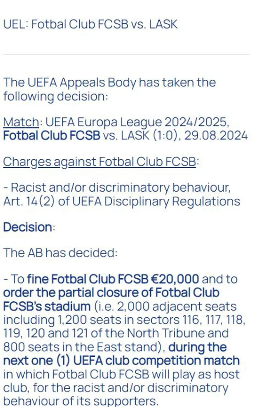 FCSB a fost sancționată de UEFA în urma meciului retur din playoff-ul Europa League împotriva austriecilor de la LASK, încheiat cu scorul de 1-0.
