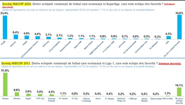 Potrivit cercetării sociologice INSCOP, realizată în anul 2013, toate echipele mari din campionatul nostru au din ce în ce mai puțini suporteri. În urmă cu 11 ani, brandul Steaua avea 51,8% dintre suporteri, Dinamo 8,8%, Rapid 5,6%, CFR Cluj 5%, Petrolul Ploiești 4,5%, FC Vaslui 1,1%, U Cluj 0,9%. Doar 19,1% dintre respondenți nu susțineau nicio echipă de fotbal.