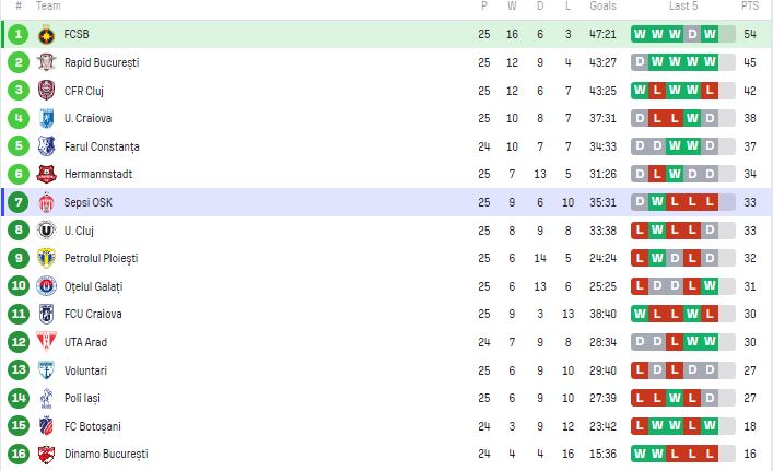 CSU Craiova e departe, pe locul 4, cu 38 de puncte. Farul are 37 de puncte, iar Hermannstadt 34 de puncte.
