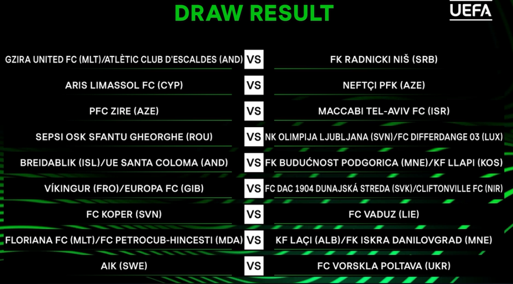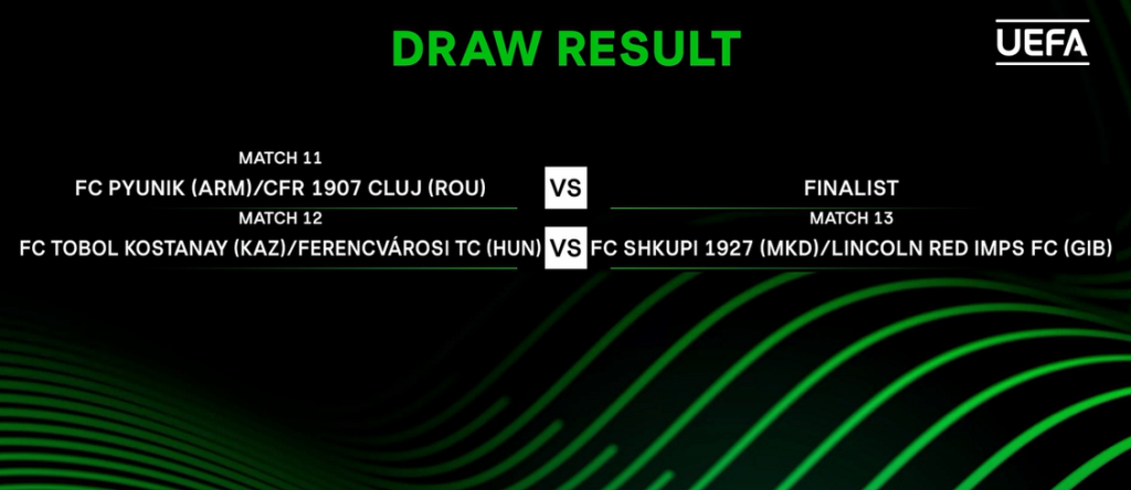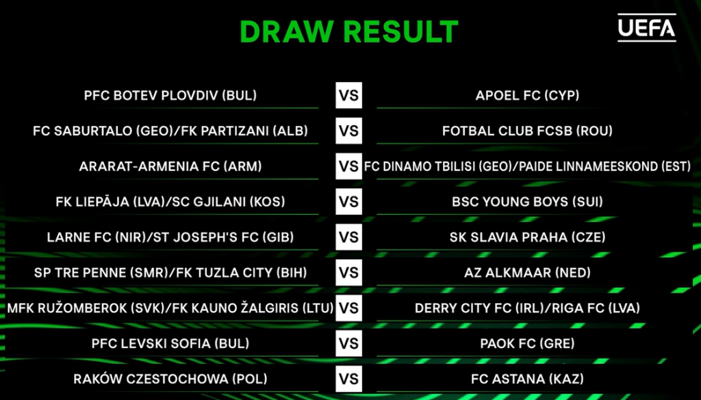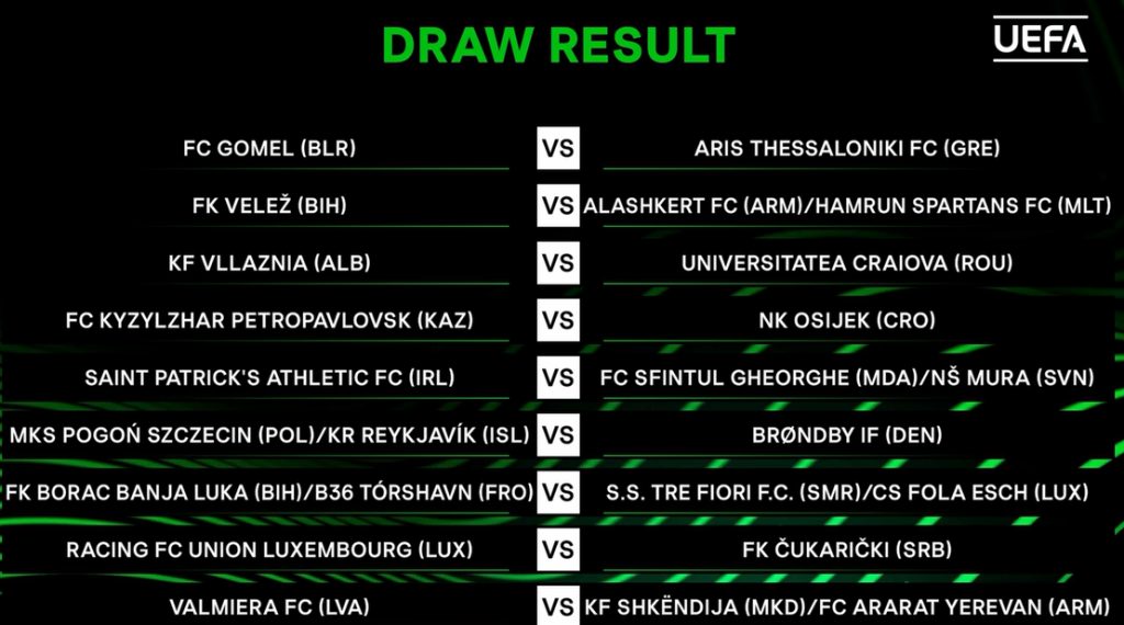 Sepsi OSK se va duela cu învingătoarea dintre Olimpija Ljubljana (Slovenia) și FC Differdange 03 (Luxemburg). Universitatea Craiova va da piept cu KF Vllaznia (Albania), iar FCSB va întâlni FC Saburtalo (Georgia) sau FK Partizani (Albania).