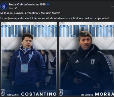 ”Mulțumim, Giovanni Costantino și Maurizio Morra! Le mulțumim pentru efortul depus în cadrul clubului nostru și le dorim mult succes pe viitor!”, a transmis FCU Craiova, pe Facebook.