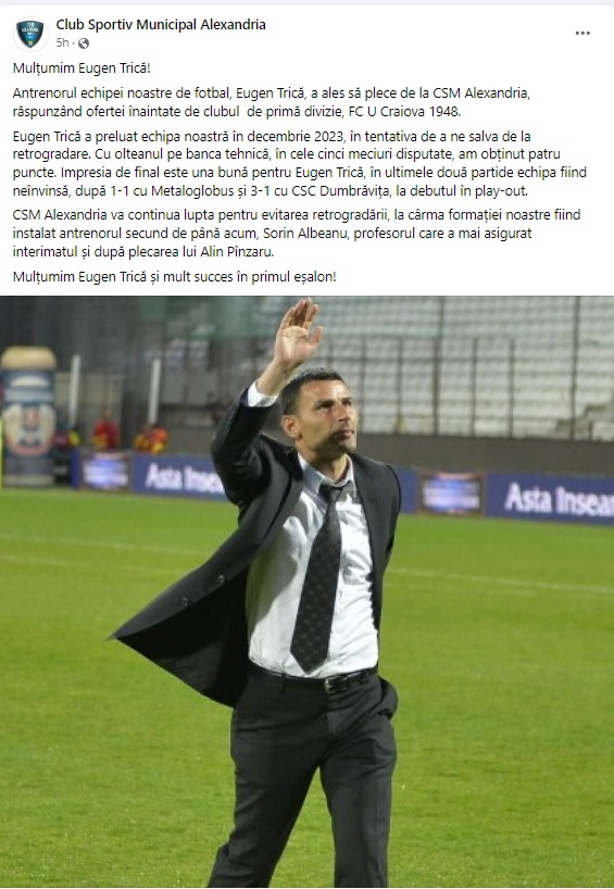 Antrenorul echipei noastre de fotbal, Eugen Trică, a ales să plece de la CSM Alexandria, răspunzând ofertei înaintate de clubul de primă divizie, FC U Craiova 1948.