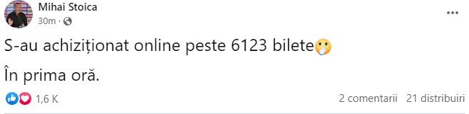 „S-au achiziționat online peste 6123 bilete. În prima oră”, a scris Mihai Stoica, pe Facebook.