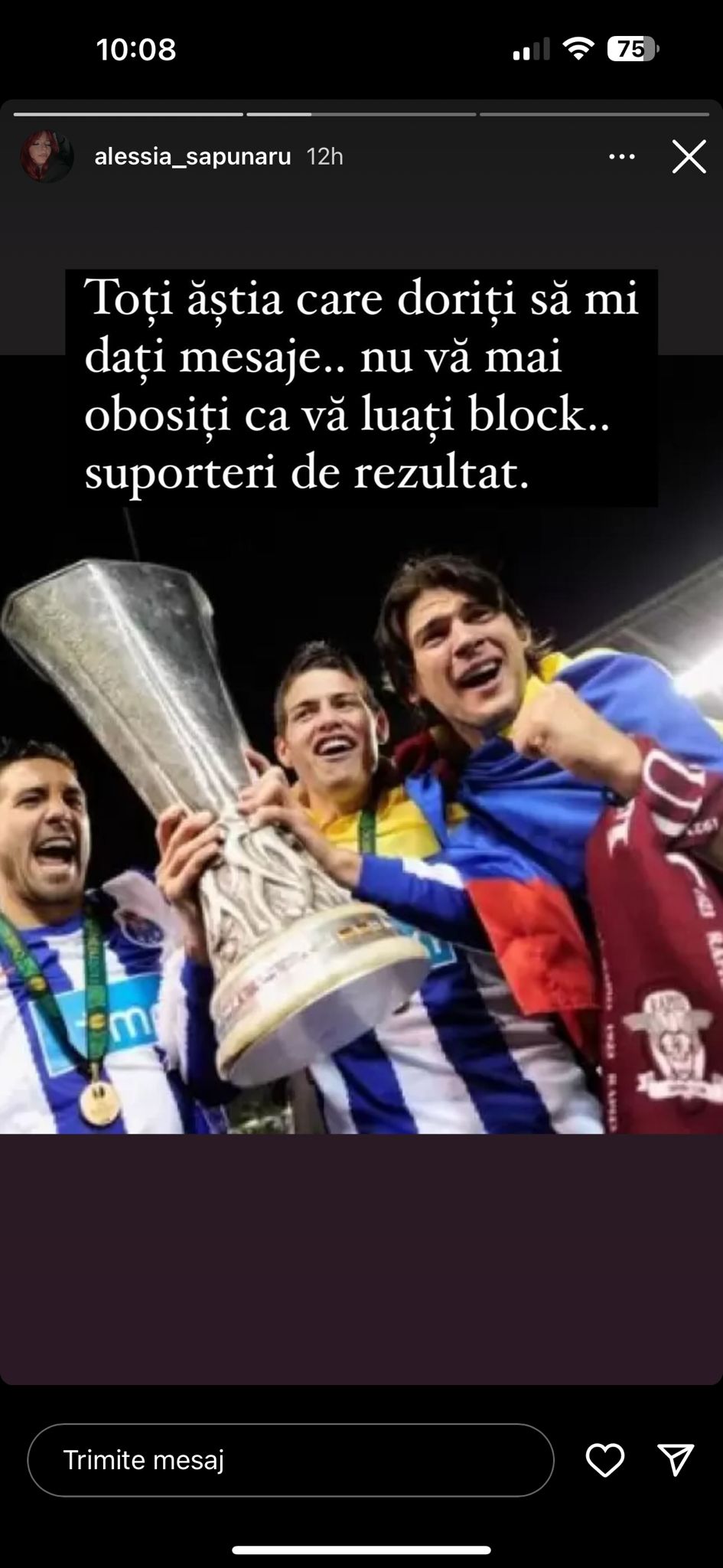 Exasperată de numărul mare de mesaje, tânăra, în vârstă de 18 ani, a postat, la rândul ei, un mesaj „acid” pe contul personal de Instagram, în replică pentru cei care îi critică tatăl: „Toți ăștia care doriți să îmi dați mesaje… nu vă mai obosiți, că vă luați block… suporteri de rezultat”.
