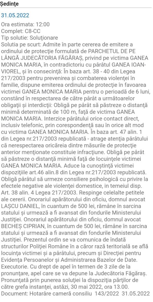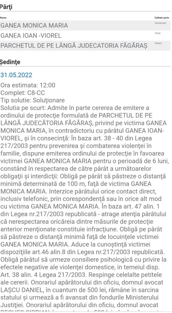 Admite în parte cererea de emitere a ordinului de protecţie formulată de PARCHETUL DE PE LÂNGĂ JUDECĂTORIA FĂGĂRAŞ, privind pe victima GANEA MONICA MARIA, în contradictoriu cu pârâtul GANEA IOAN-VIOREL, şi în consecinţă: În baza art. 38 – 40 din Legea 217/2003 pentru prevenirea şi combaterea violenţei în familie, dispune emiterea ordinului de protecţie în favoarea victimei GANEA MONICA MARIA pentru o perioadă de 6 luni, constând în respectarea de către pârât a următoarelor obligaţii şi interdicţii: Obligă pe pârât să păstreze o distanţă minimă determinată de 100 m, faţă de victima GANEA MONICA MARIA. Interzice pârâtului orice contact direct, inclusiv telefonic, prin corespondenţă sau în orice alt mod cu victima GANEA MONICA MARIA”, se arată în decizia instanței.