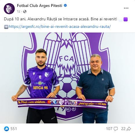 Alexandru Răuță a dezvăluit că nu a dus lipsă de oferte din Superliga, dar a ales FC Argeș din dorința de a fi aproape de familie. Potrivit spuselor sale, echipa are toate șansele să revină în elită după un singur an de pribegie.