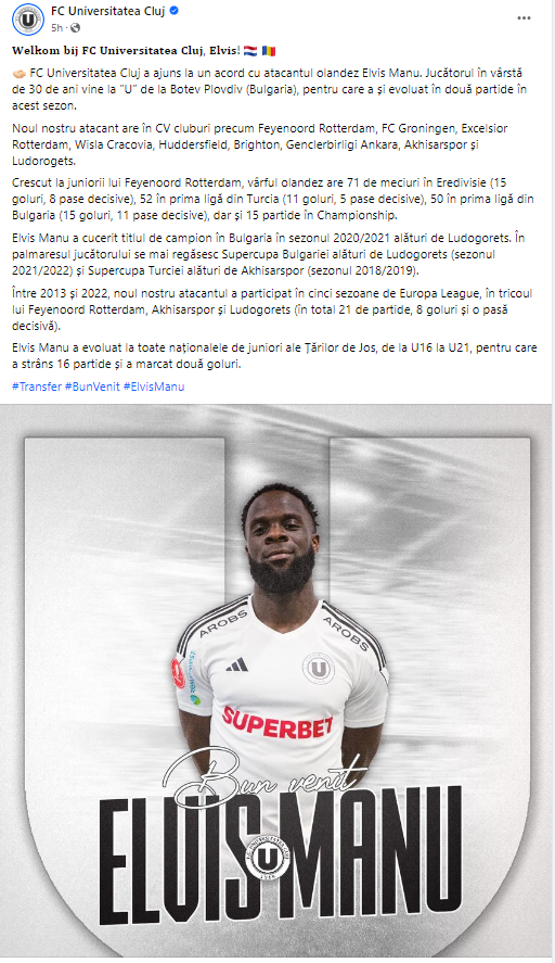 „FC Universitatea Cluj a ajuns la un acord cu atacantul olandez Elvis Manu. Jucătorul în vârstă de 30 de ani vine la ”U” de la Botev Plovdiv (Bulgaria), pentru care a și evoluat în două partide în acest sezon. Noul nostru atacant are în CV cluburi precum Feyenoord Rotterdam, FC Groningen, Excelsior Rotterdam, Wisla Cracovia, Huddersfield, Brighton, Genclerbirligi Ankara, Akhisarspor și Ludorogets.