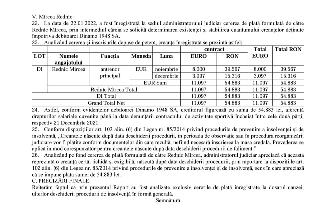 La data de 22.01.2022, a fost înregistrată la sediul administratorului judiciar cererea de plată formulată de către „Puriu”, prin intermediul căreia se solicită determinarea existenței și stabilirea cuantumului creanțelor deținute împotriva debitoarei Dinamo 1948 SA. Astfel, urmează să se înscrie la masa credală a societății aflate în insolvență cu suma de 11.097 euro, ceea ce reprezintă salariul pentru lunile noiembrie și decembrie (până pe data de 21, când a fost demis).