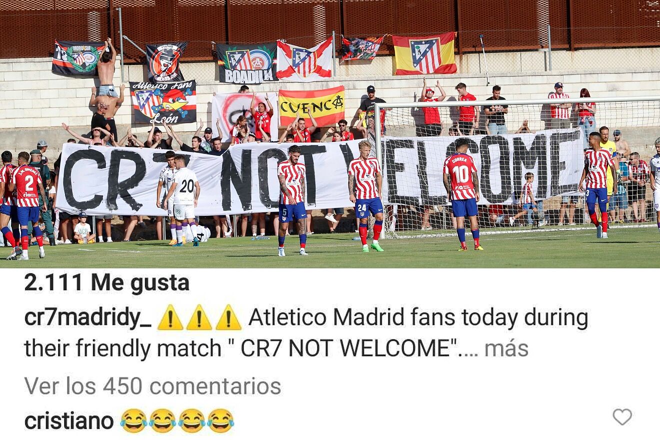 Perspectiva de a juca în Europa League nu îl mulțumește pe CR7. Portughezul caută cu disperare o echipă de top, cu care să joace în Liga Campionilor. Dar variantele nu prea există. Rând pe rând, Bayern, PSG sau chiar fosta lui echipă, Real Madrid, au negat că l-ar dori pe fotbalistul de 37 de ani. Apoi a apărut varianta Atletico Madrid, în ciuda problemelor financiare ale spaniolilor. Cu toate acestea, suporterii alb-roșiilor, au protestat numai la ideea de a-l vedea pe fostul mare rival în tricoul favorit. Aceștia au protestat pe rețelele de socializare, dar și la un meci amical, unde au venit cu un mesaj contra portughezului.