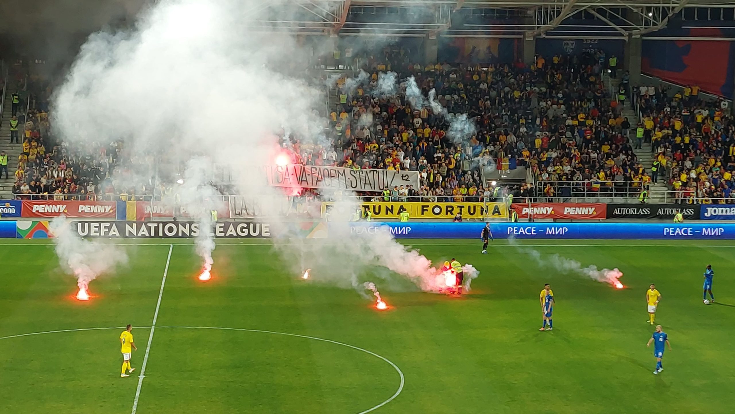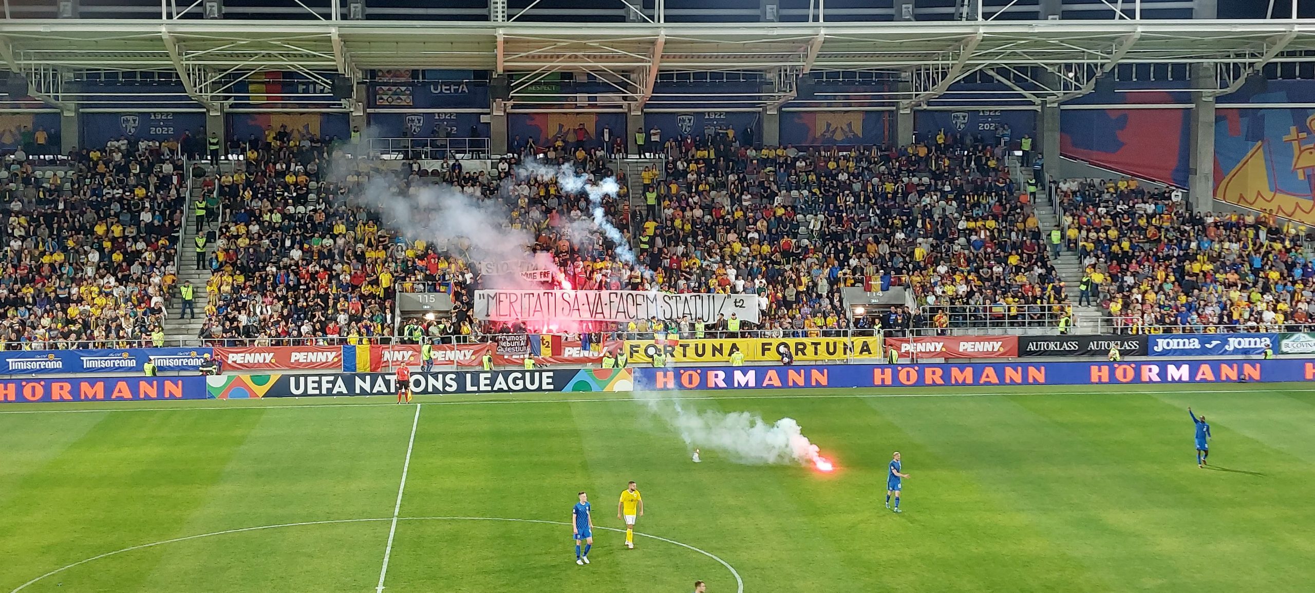Naționala riscă iar sancțiuni drastice din partea UEFA. Suporterii prezenți pe stadionul Giulești au fost extrem de supărați încă dinaintea partidei cu Finlanda, dar au „explodat” după ce George Pușcaș a ratat penalty-ul din minutul 16. Fanii au scandal pe durata întregii prime reprize împotriva FRF și au aruncat cu torțe și fumigene pe teren.