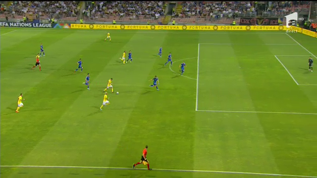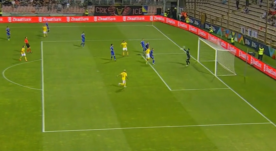 George Pușcaș nu a avut nevoie de mult timp pentru a se remarca. Totul, deși Bosnia a început agresiv, în terenul nostru. Întâi, atacantul a primit o minge, apoi l-a servit pe Răzvan Marin, care s-a pripit și a finalizat de la marte distanță. La mare distanță s-a dus și mingea de poartă.
