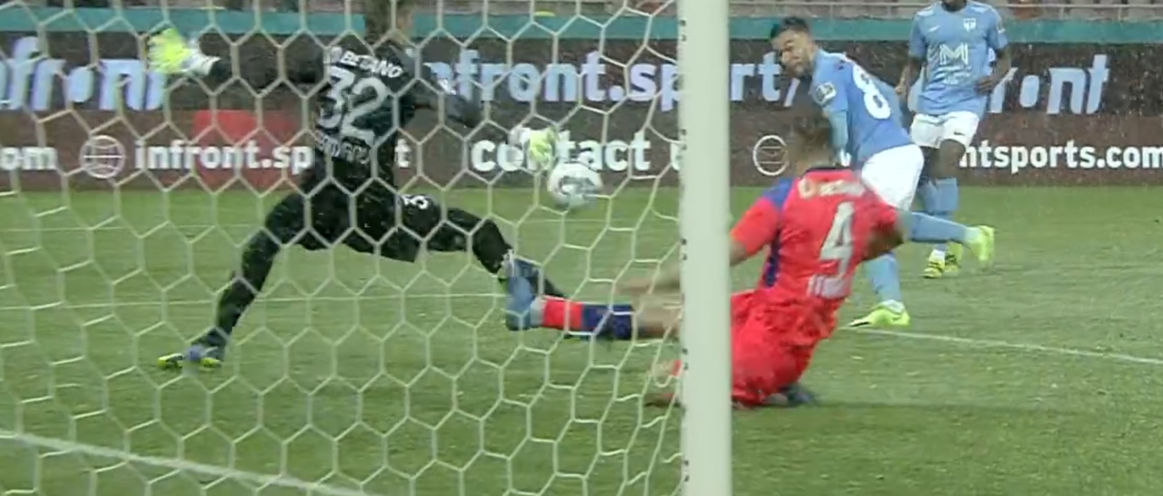 Cu toți jucătorii în atac, FCSB a fost surprinsă pe final. Voluntari a scăpat pe contră într-un atac supranumeric. Meleke a pasat pentru Fulop, care s-a trezit singur cu poarta goală.(Min 86)