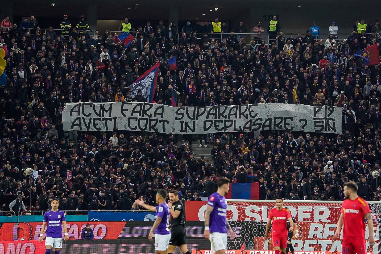Imediat, Peluza Nord și-a etalat scenografia. Ultrașii conduși de Gheorghe Mustață au desfășurat un banner cu mesajul „Hrănește-ți forța cu propria ură”.