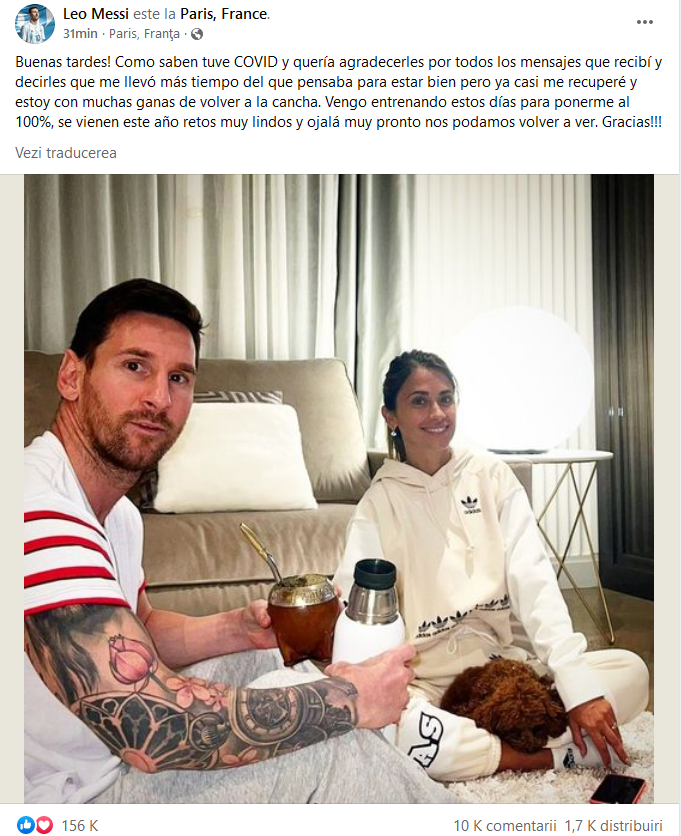 Lionel Messi a fost testat din nou, dar, de această dată, testul a fost negativ. El a plecat spre Paris cu un avion privat, pentru a se alături colegilor săi. Conform celor de la Marca.com, citați de către La Nacion, Messi s-a vindecat de virus. Totuși, postarea de pe Facebook arată contrariul.
