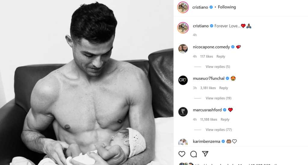 Cristiano Ronaldo (37 de ani) a publicat prima fotografie alături de fiica sa nou-născută. Imaginea a strâns 10 milioane de like-uri pe Instagram, în primele patru ore de la apariție.