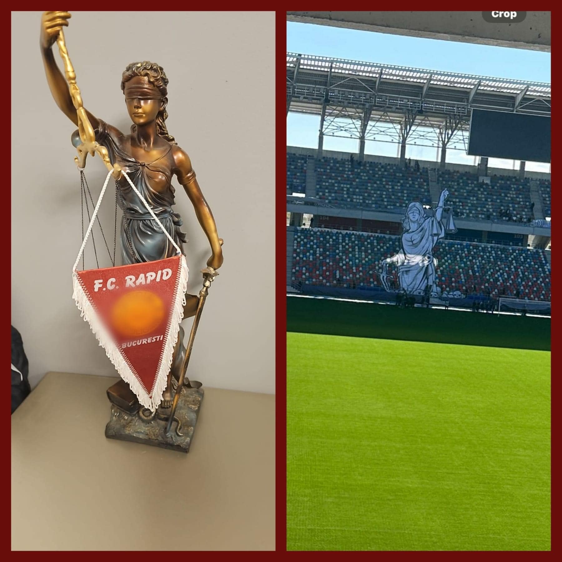 Este vorba despre un banner cu Themis, zeița dreptății divine, reprezentată ca o femeie impunătoare, legată la ochi, care ține într-o mână o balanță și în cealaltă o sabie, plus mesajul „justiția e oarbă”, aluzie, mai mult ca sigur, la faptul că instanța i-a dat dreptate Clubului Armatei în procesul cu FCSB pentru palmaresul Stelei.