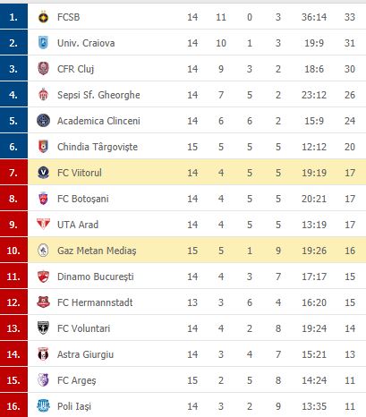 UPDATE, ora 22:25 / Viitorul pierde la Mediaș, scor 0-1, și își micșorează șansele de a prinde un loc în play-off. Mircea Rednic are un start ratat la formația din Constanța. Are un singur punct din primele trei partide disputate de când a venit la Viitorul. Iată cum arată clasamentul Ligii 1, după primele două partide din etapa a 15-a.