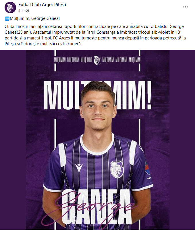 Clubul nostru anunță încetarea raporturilor contractuale, pe cale amiabilă, cu fotbalistul George Ganea (23 de ani). Atacantul împrumutat de la Farul Constanța a îmbrăcat tricoul alb-violet în 13 partide și a marcat un gol. FC Argeș îi mulțumește pentru munca depusă în perioada petrecută la Pitești și îi dorește mult succes în carieră.”, se arată pe pagina Fotbal Club Argeș Pitești.