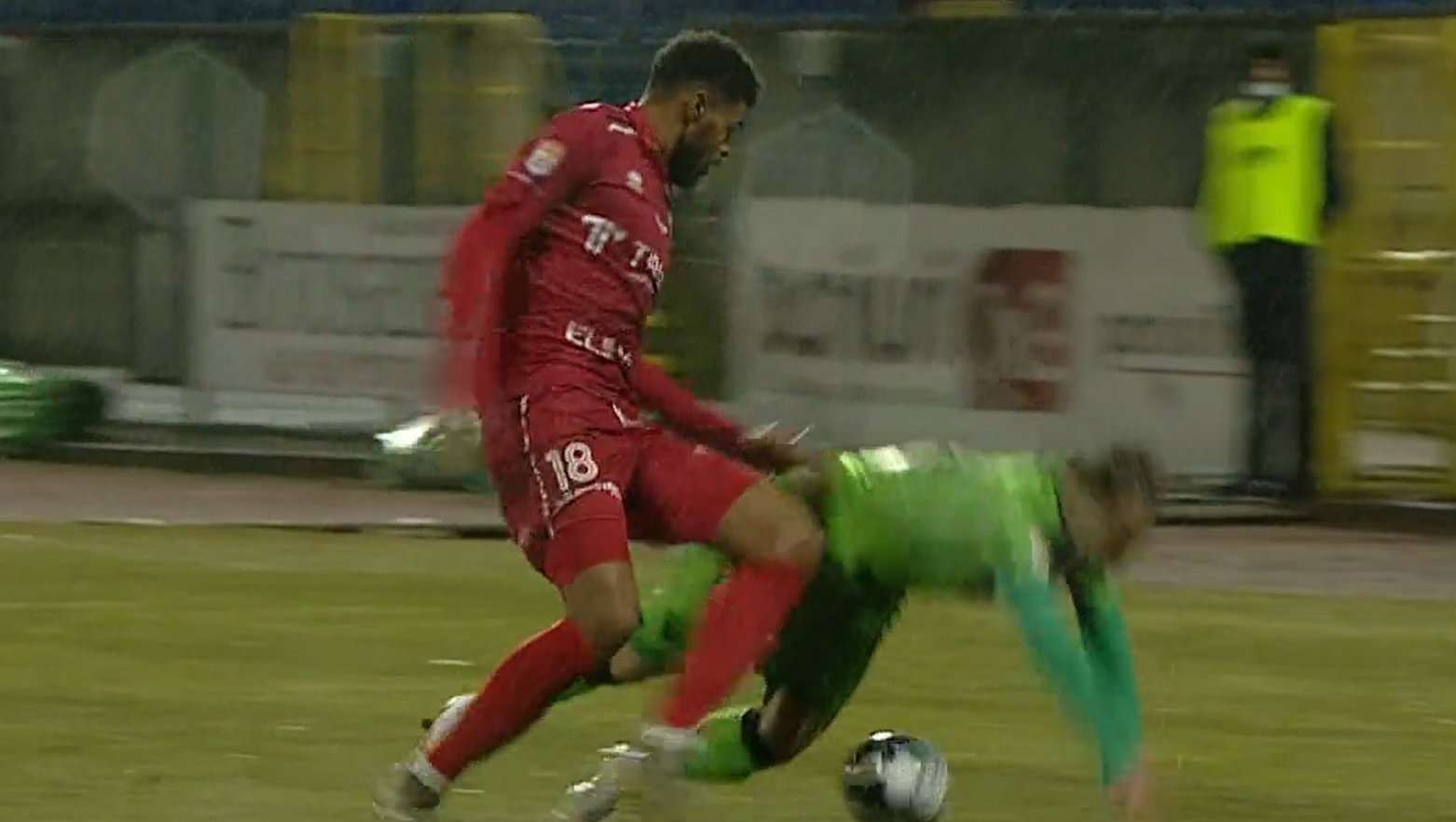 Edjouma a pus piciorul în fața mingii și l-a scos pe adversar de pe traiectorie. Tomozei a căzut la pământ și a acuzat o lovitură în zona genunchiului.