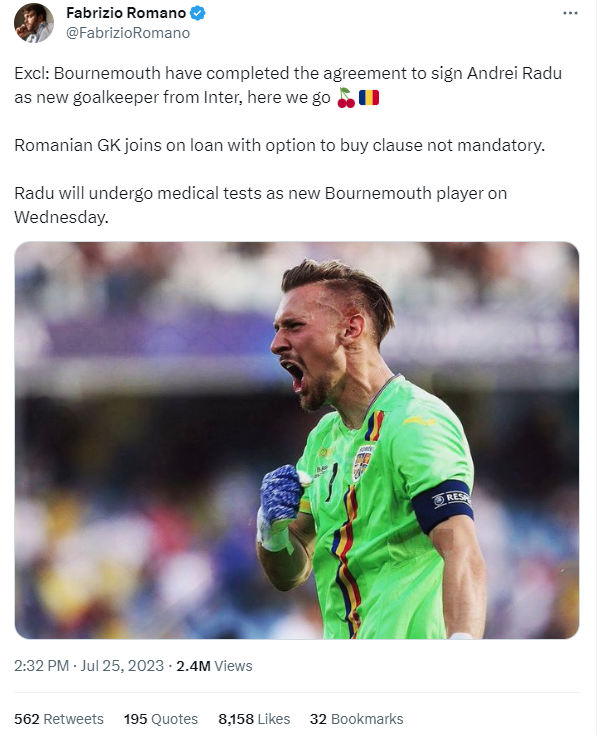 Duminică, PlaySport a scris, în premieră, despre interesul celor de la Bournemouth pentru Ionuț Radu. Faimosul jurnalist Fabrizio Romano confirmă exclusivitatea PlaySport și anunță că Bournemouth a ajuns la o înțelegere, cu Inter, pentru împrumutul lui Radu, cu opțiune de cumpărare definitivă.