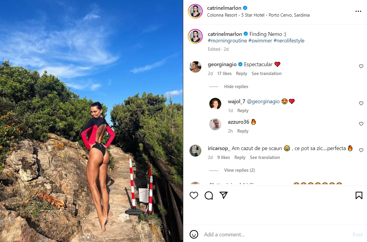Iubita lui Cristiano Ronaldo pare că nu s-a putut abține și i-a lăsat un comentariu lui Catrinel Marlon: „Espectacular”, i-a scris aceasta în dreptul pozei. În traducere liberă: „Spectaculoasă”.