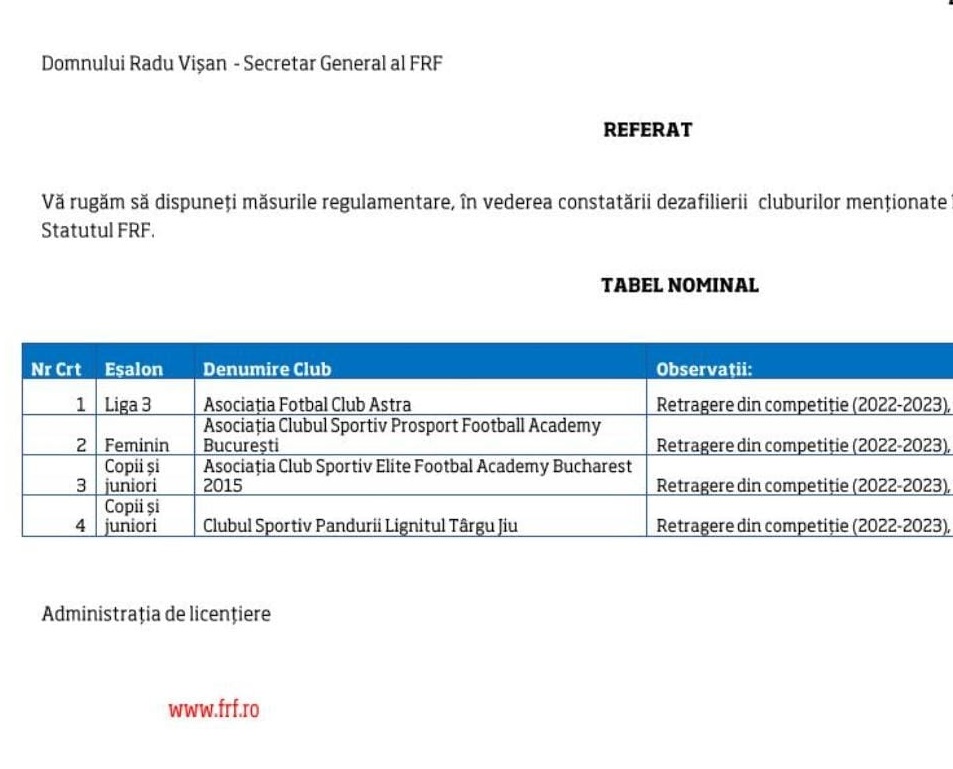Astra Giurgiu și Pandurii Târgu Jiu, formații de Europa League în trecut, sunt istorie. Conform deciziilor ultimului Comitet Executiv al Federației Române de Fotbal, cele două cluburi au fost dezafiliate. Astfel, ca multe alte exemple din ultimii ani, campioana din 2016 și vicecampioana din 2013 dispar de pe harta fotbalului autohton.