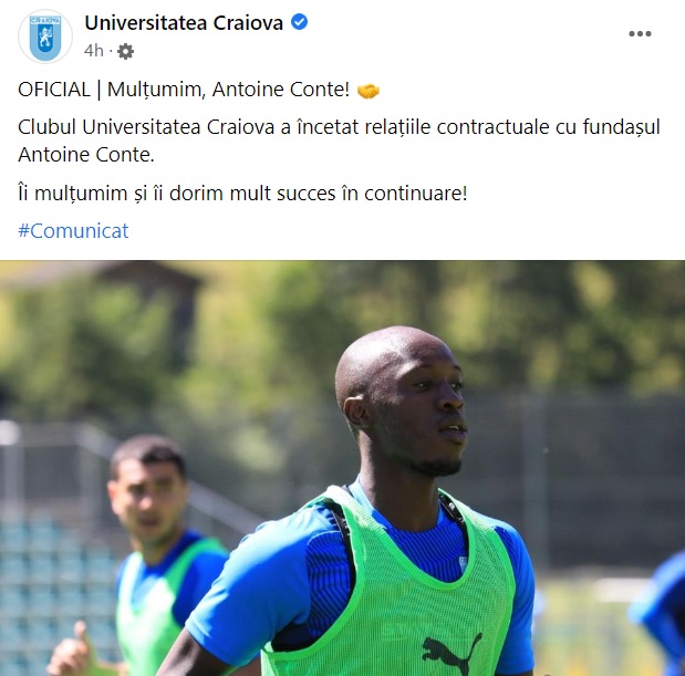 „Mulțumim, Antoine Conte! Clubul Universitatea Craiova a încetat relațiile contractuale cu fundașul Antoine Conte. Îi mulțumim și îi dorim mult succes în continuare”, a fost mesajul transmis de oficialii Universităţii Craiova.