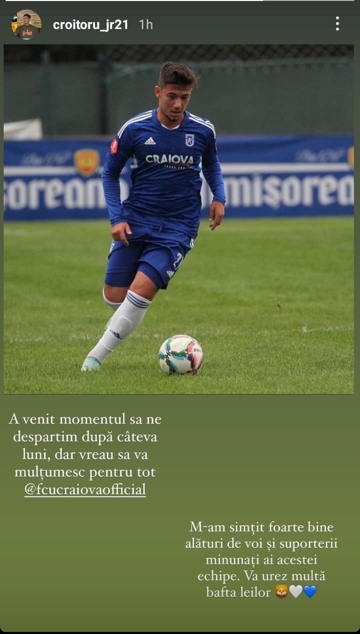FC U. Craiova trece prin momente grele. Echipa din Bănie a rămas fără antrenor, a venit rândul ca un jucător să părăsească echipa. Este chiar vorba despre fiul lui Marius Croitoru, David. Acesta și-a anunțat fanii pe propria pagină de Instagram că va pleca de la echipă.