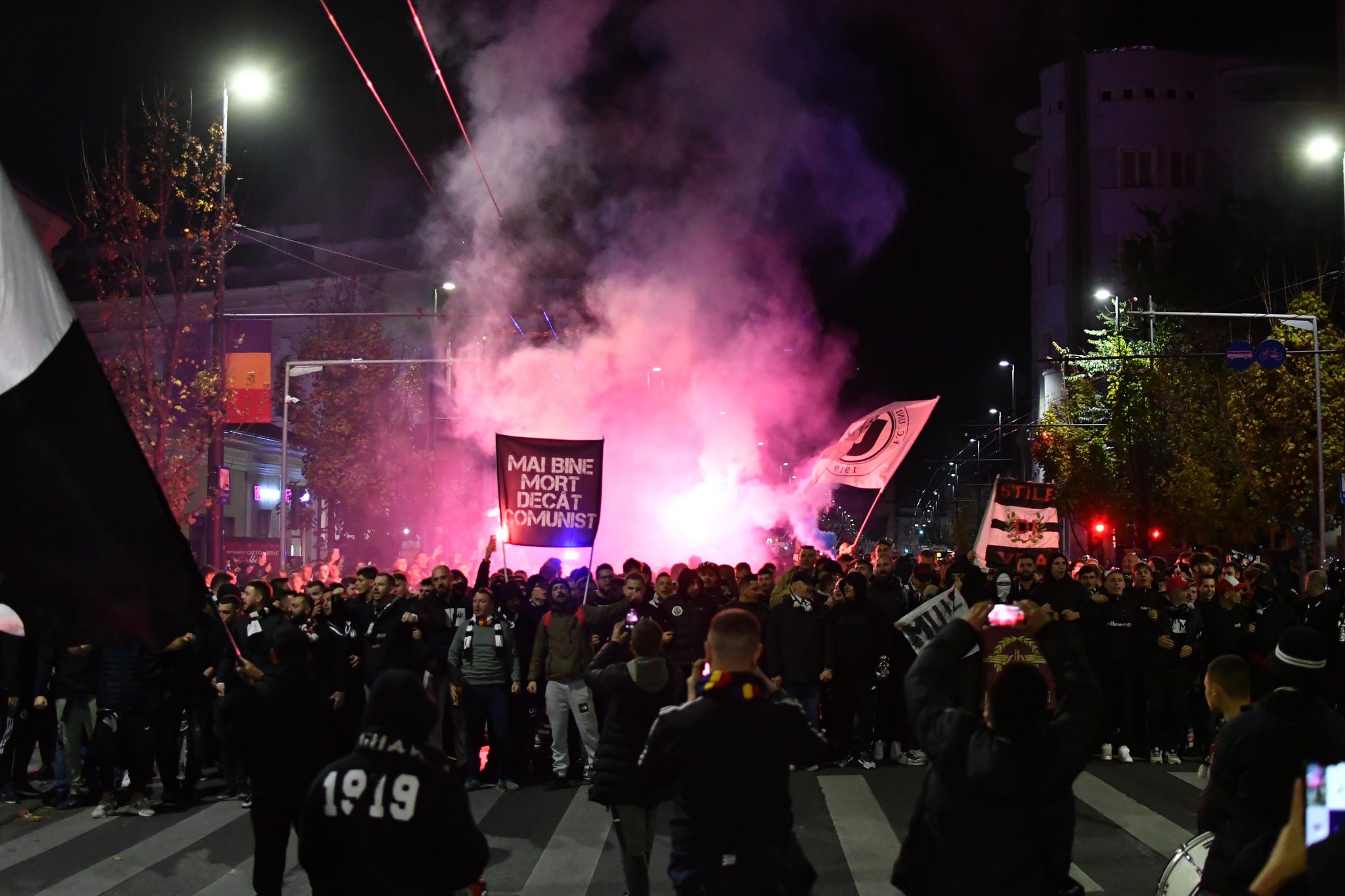 Suporterii din Gruia au preferat, totuși, un show mai „cuminte”. Au afișat steagul României, alături de culorile vișinii, și au aprins câteva torțe.