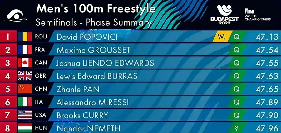UPDATE 19:28 AUR!!! David Popovici a câștigat incredibil finala în proba de 100 metri liberi, la Campionatul Mondial de natație de la Budapesta. Românul a câștigat cu un timp de 47.58. Pe locul 2 s-a clasat francezul Maxime Grousset, la șase sutimi în urma lui Popovici. Podiumul este completat de canadianul Joshua Liendo Edwards, cu 47.71.