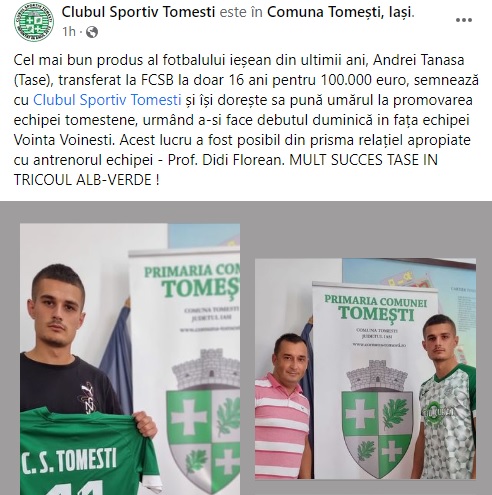 Cel mai bun produs al fotbalului ieșean din ultimii ani, Andrei Tănasă (Tase), transferat la FCSB la doar 16 ani pentru 100.000 euro, semnează cu CS Tomeşti și își dorește să pună umărul la promovarea echipei tomeştene, au transmis şefii de la Tomeşti.
