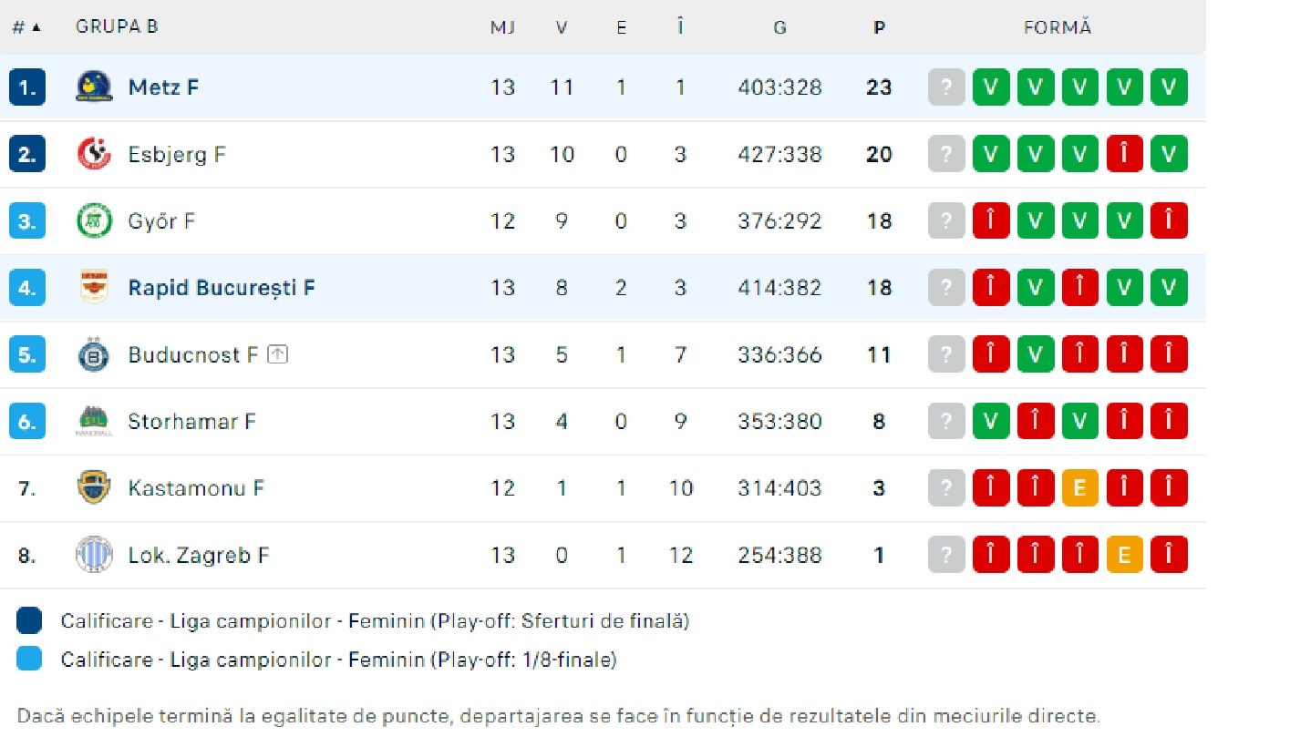 În urma acestei victorii, Metz și-a asigurat locul 1 în această grupă și va merge direct în sferturi. În ultima etapă, Rapid va juca în Sala Polivalentă din București contra celor de la Lokomotiva Zagreb, echipa aflată pe ultimul loc în această grupă B. Dar, chiar și în cazul unei victorii, campioana României are nevoie de un joc favorabil al rezultatelor din celelalte meciuri pentru a putea spera la locul doi.