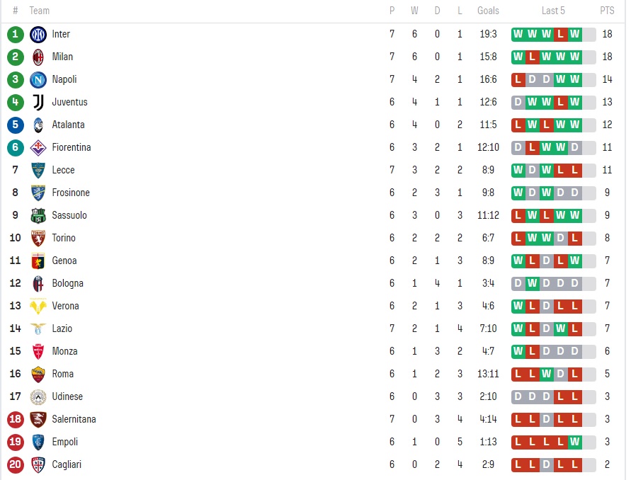 Inter a pierdut un singur joc în acest sezon, 2-1 la Sassuolo, și le-a câștigat pe celelalte 6. Tot în top se mai află rivala Milan, cu același număr de puncte, 18, dar cu golaveraj mai slab. Campioana Napoli e pe 3, cu 14 puncte, în timp ce Juve e a 4-a, cu 13, dar și un meci mai puțin disputat.