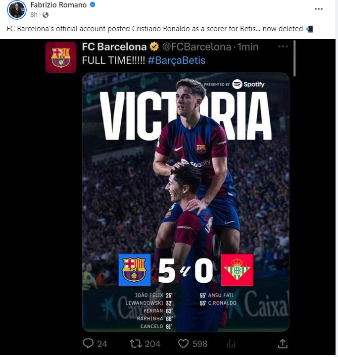 Gafa este una de proporții, având în vedere că Ronaldo este rivalul de moarte al Barcelonei și, în prezent, joacă la Al-Nassr, în timp ce Ansu Fati a fost împrumutat de catalani, în această vară, la Brighton. La scurt timp, postarea cu pricina a fost ștearsă de administratorul paginii.